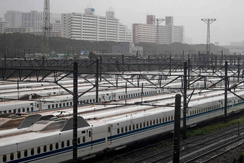 Tàu siêu tốc đường dài "shinkansen" ngừng hoạt động ở Tokyo (Nhật) ngày 12-10. Ảnh: AFP