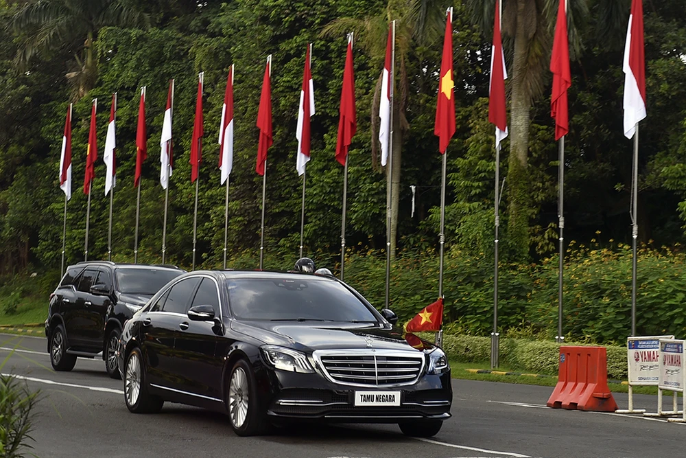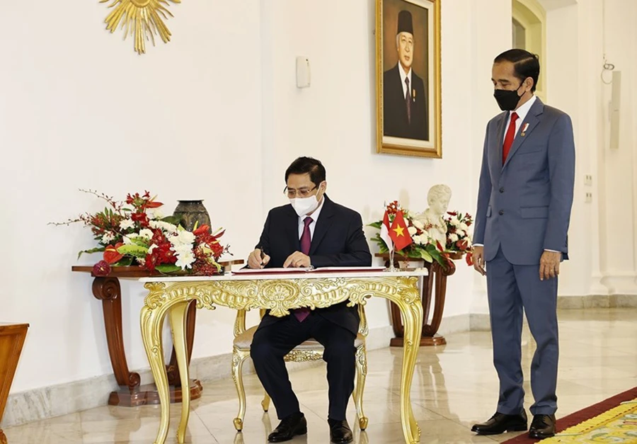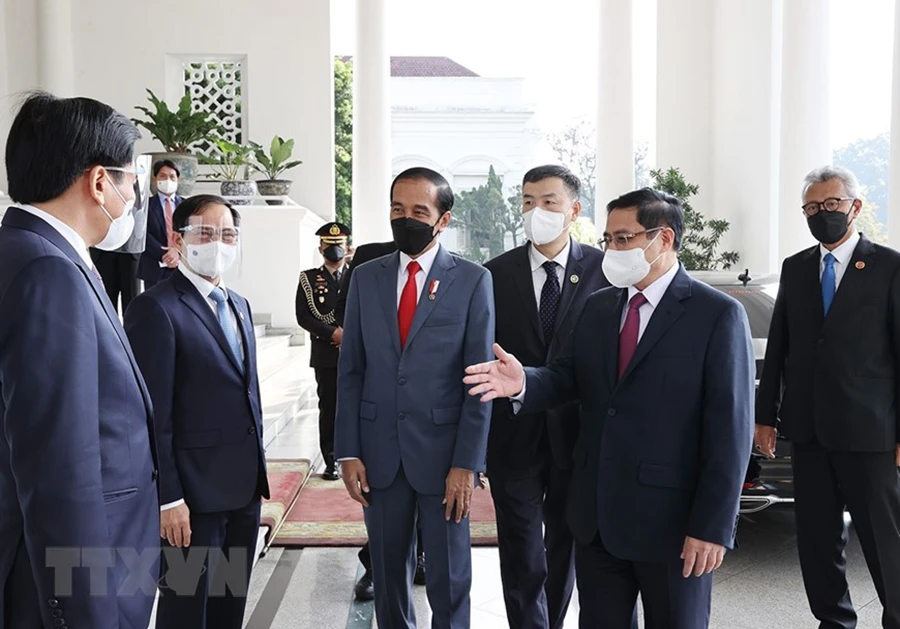 Thủ tướng Phạm Minh Chính chào xã giao Tổng thống Indonesia Joko Widodo. Ảnh: TTXVN