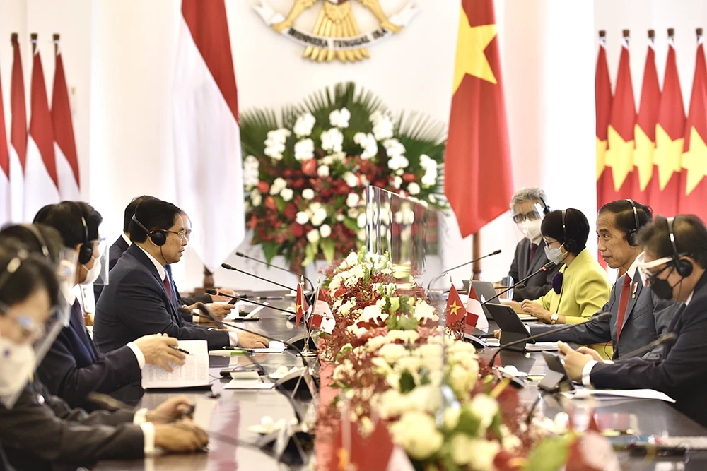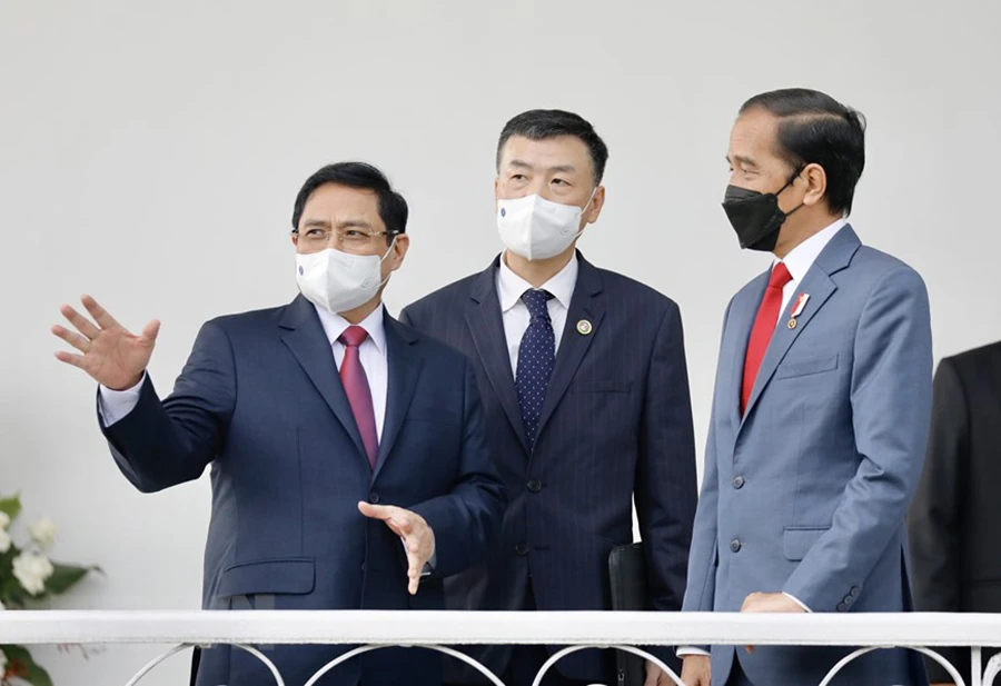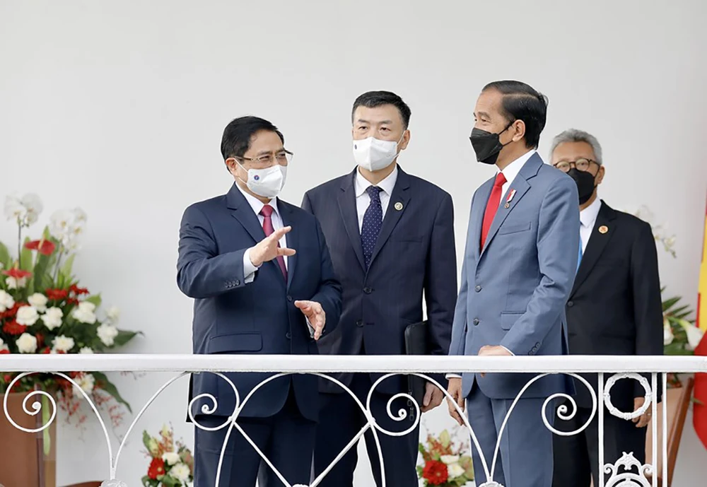Thủ tướng Phạm Minh Chính và Tổng thống Indonesia Joko Widodo có cuộc gặp song phương trước thềm Hội nghị các nhà lãnh đạo ASEAN. Ảnh: TTXVN