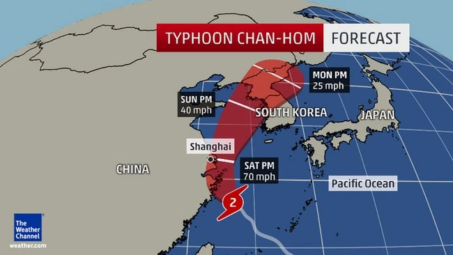 Theo các chuyên gia dự báo, siêu bão Chan-hom sẽ là cơn bão thứ hai tấn công vào Trung Quốc trong hai ngày tới sau khi trước đó cơn bão khắc nghiệt Linfa đổ bộ theo hướng tỉnh Quảng Đông (vùng màu đỏ là vùng dự báo bão sẽ ảnh hưởng trong 2 ngày tới) (ảnh: The Weather Channel)