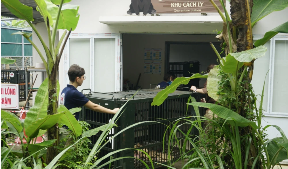 Tại nhà chung, gấu Cam được chuyển vào khu cách ly để kiểm tra sức khoẻ.