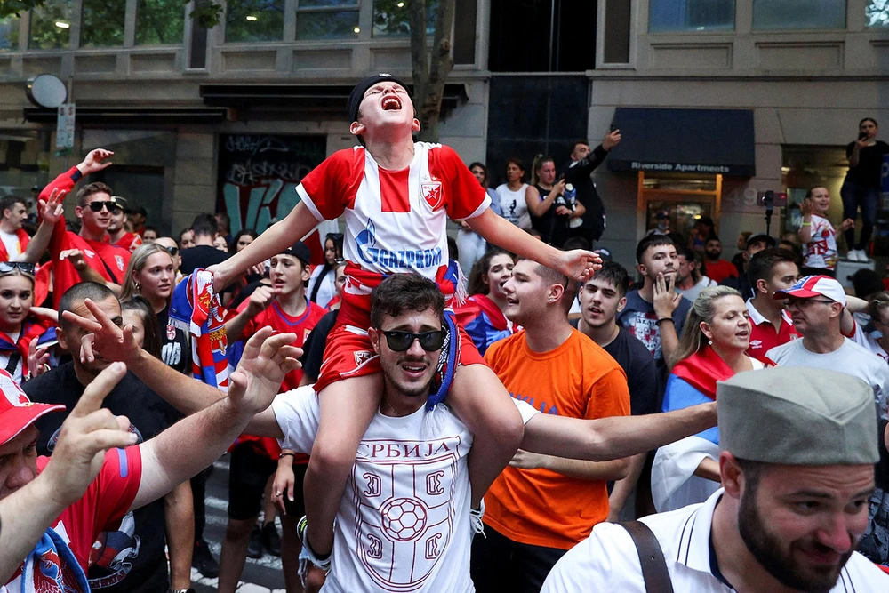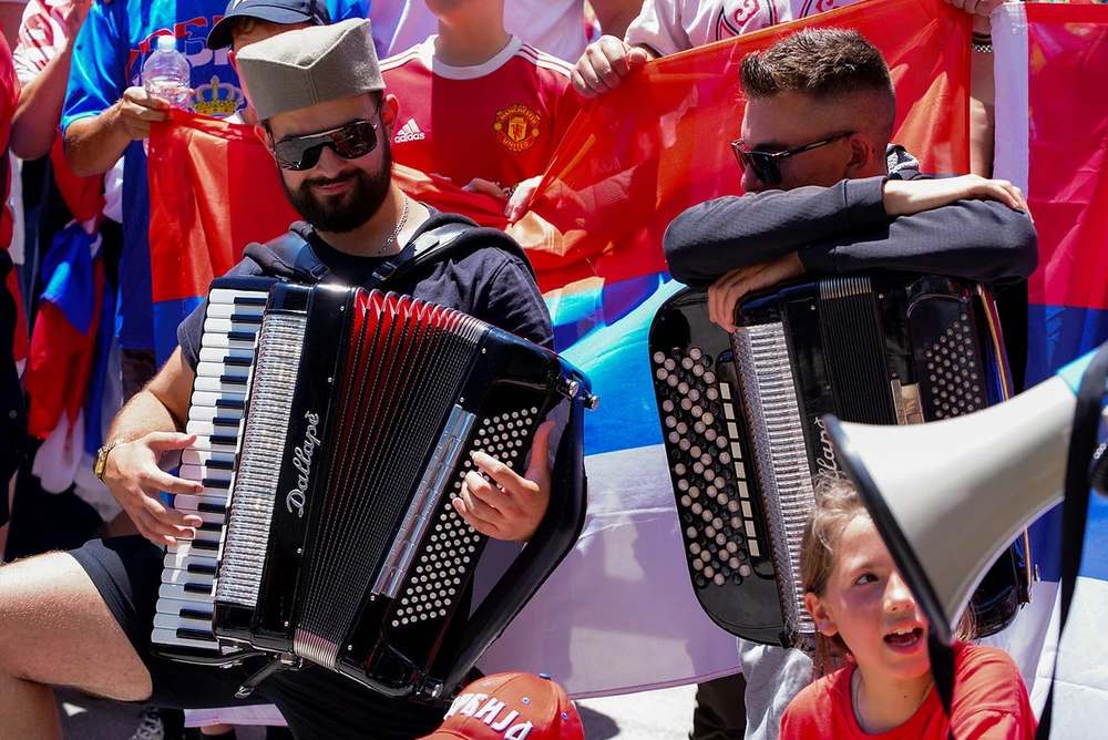 Cờ xí và đàn acordeon, dân Serbia ăn mừng chiến thắng.
