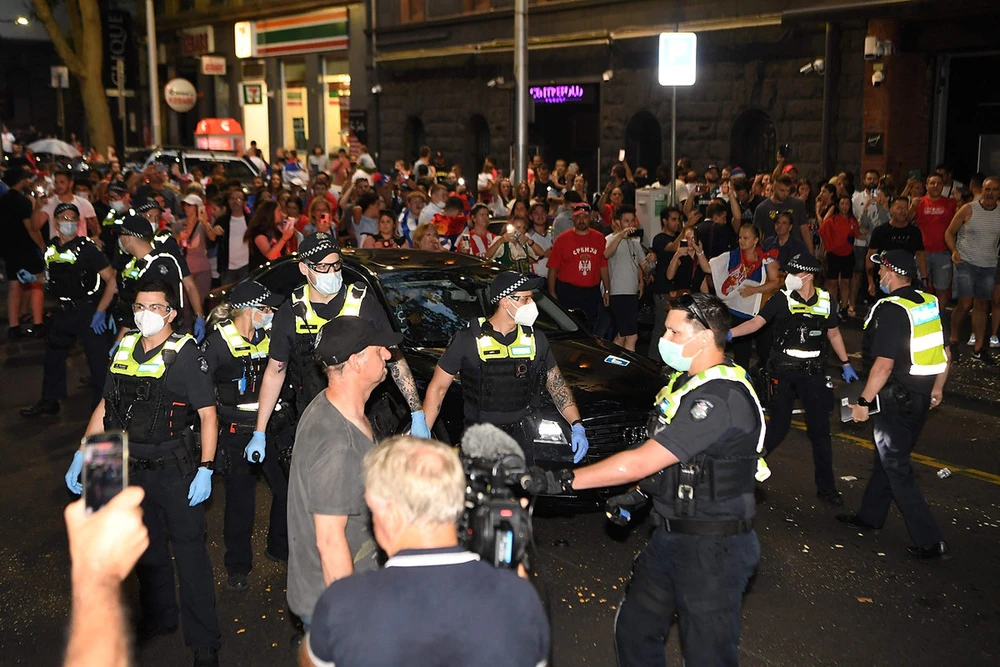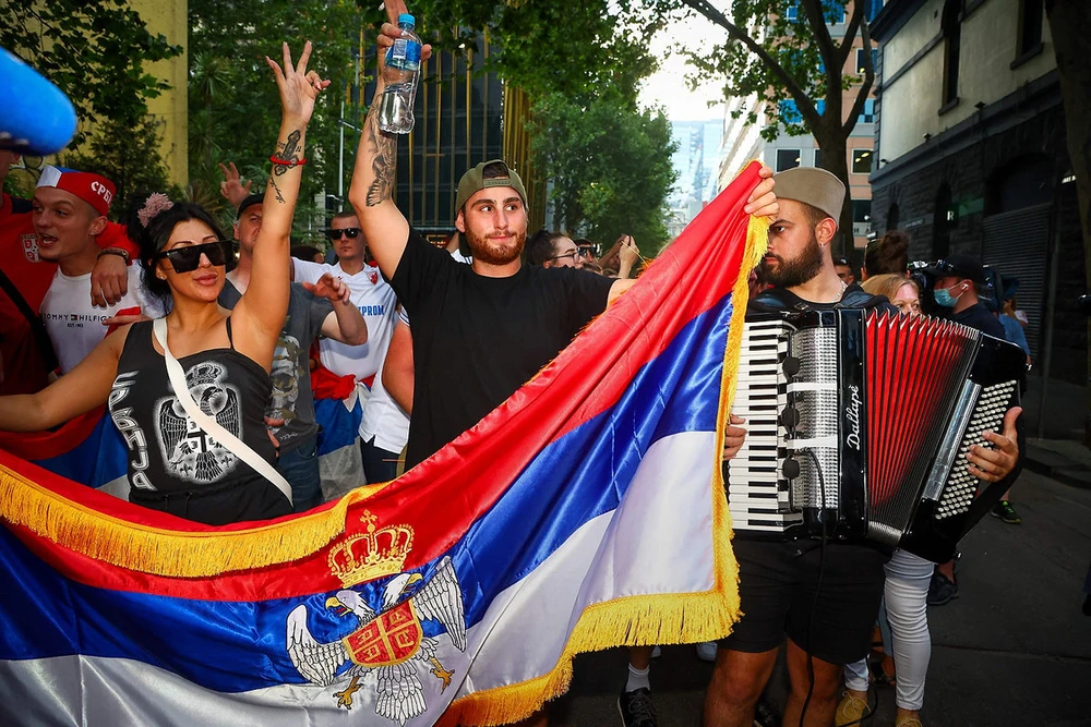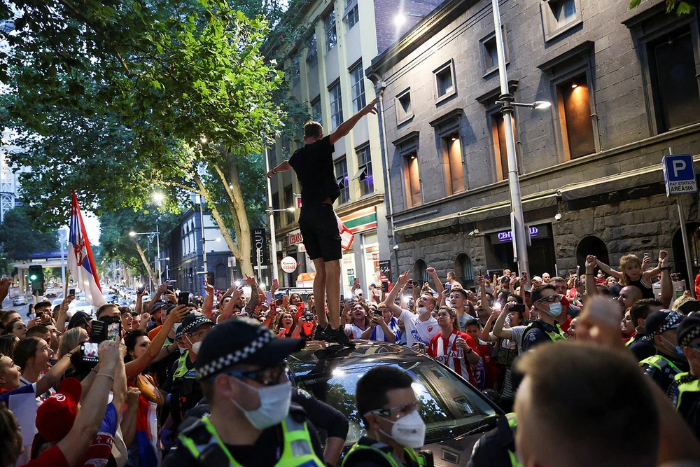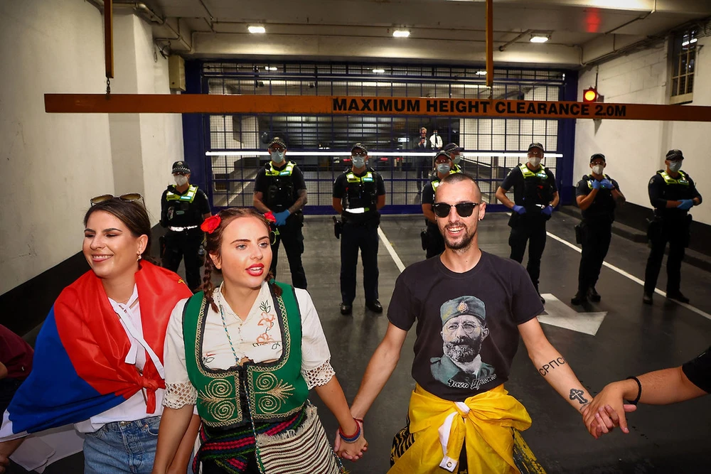 Cộng đồng người Úc gốc Serbia bên trong lối xe vào của khách sạn tạm giam người nhập cư chưa đủ thủ tục ở Melbourne, nơi Djokovic trải qua bốn ngày.