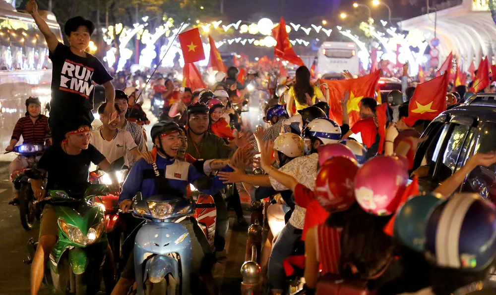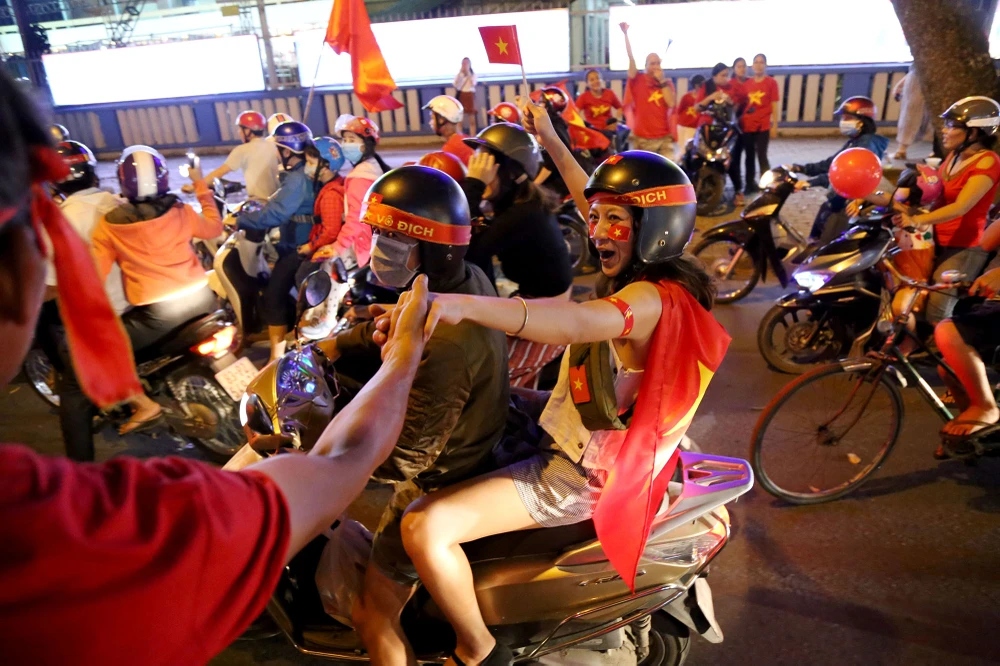 Ngợp sắc đỏ và những cái bắt tay chúc mừng U-23 Việt Nam sau trận chung kết.