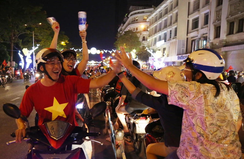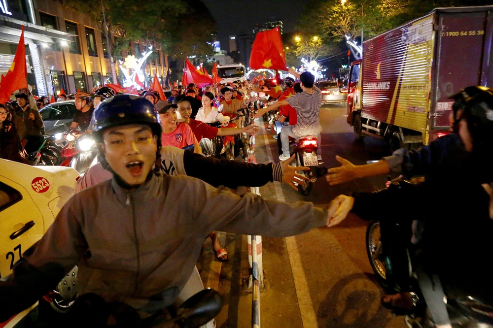 Người hâm mộ bắt tay chúc mừng nhau khi di chuyển trên đường Nguyễn Thị Minh Khai (quận 1).