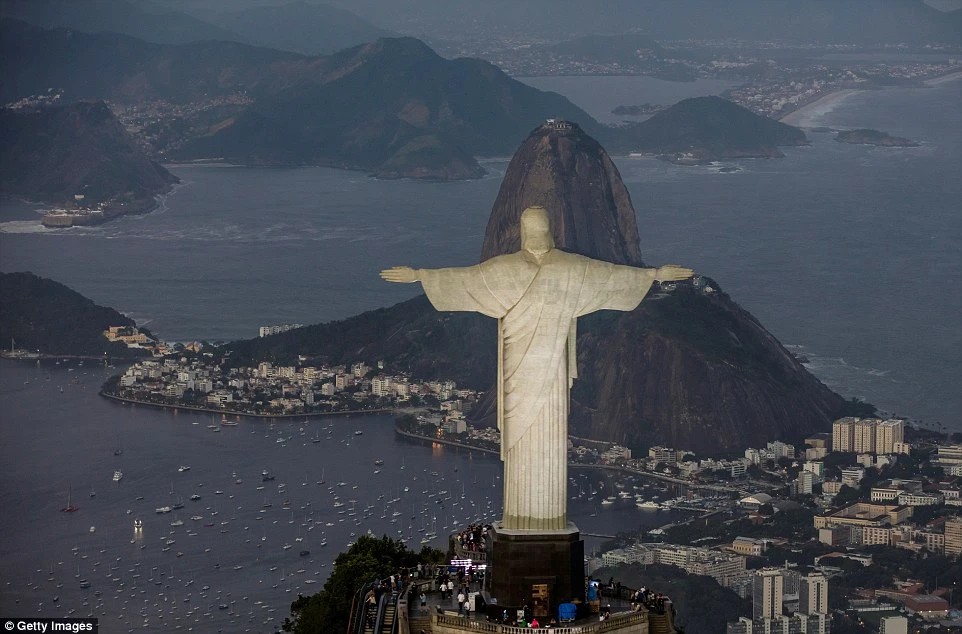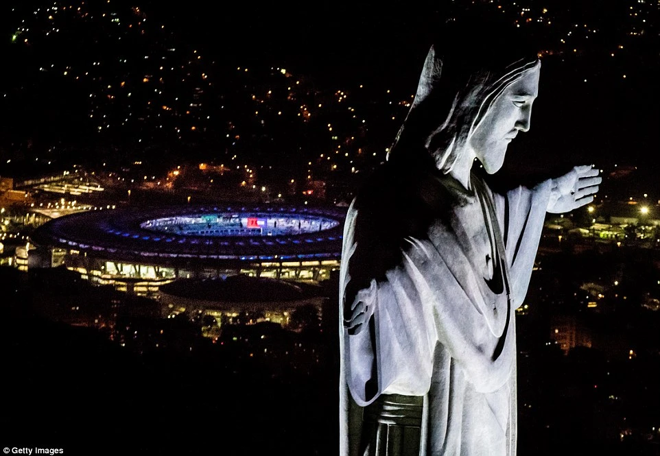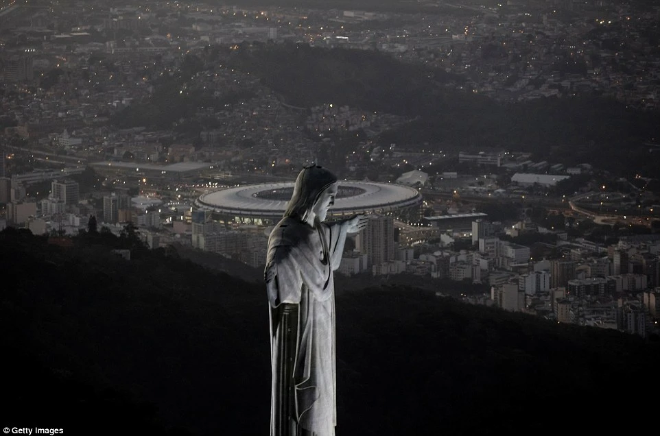 Bức tượng chụp chúa Giê Su, phía xa là sân vận động huyền thoại Maracana có sức chứa 200.000 chỗ.
