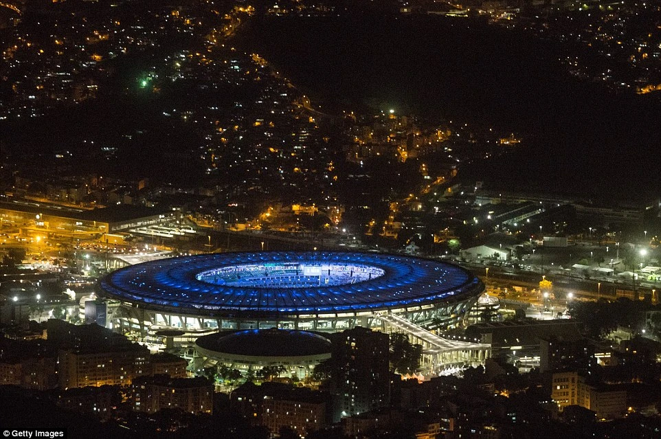 SVĐ Maracana đẹp ngỡ ngàng về đêm với ánh sáng xanh. Đây sẽ là nơi diễn ra lễ khai mạc và bế mạc Olympic Rio.