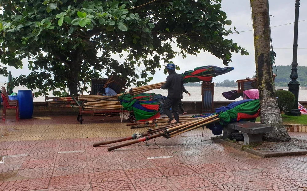 Người dân bán hàng khu du lịch Đồ Sơn thu dọn đồ đạc phòng chống bão số 2 đổ bộ.