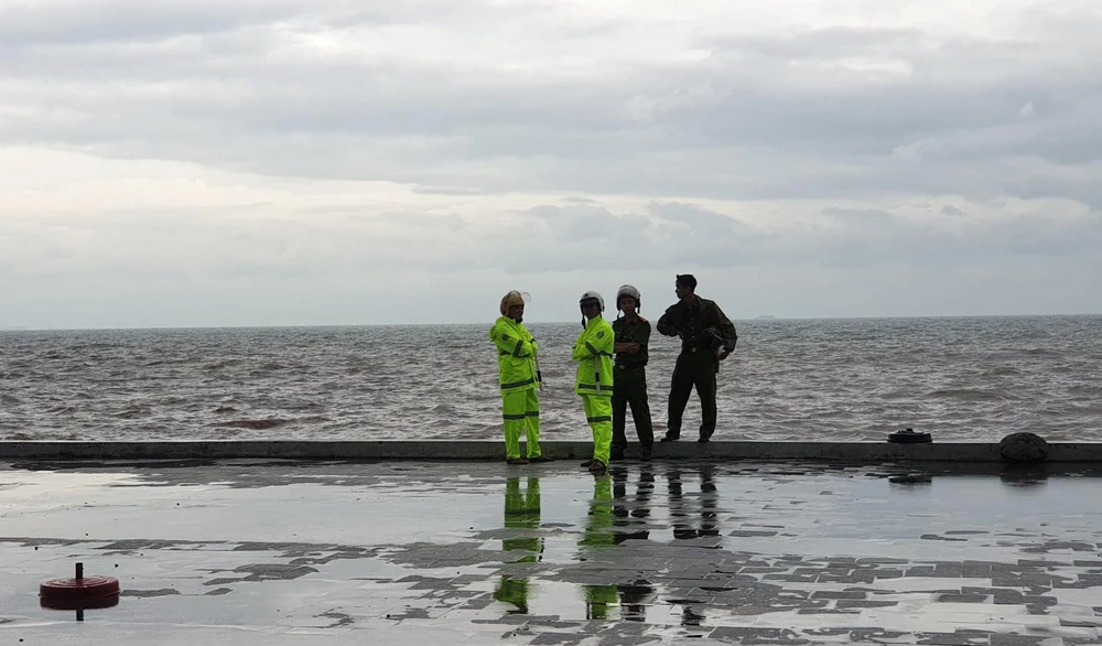 Tại khu 1 Đồ Sơn, lực lượng công an và dân quân tự vệ túc trực ngăn ngừa du khách ra mép bờ kè nơi có sóng biển dâng cao.