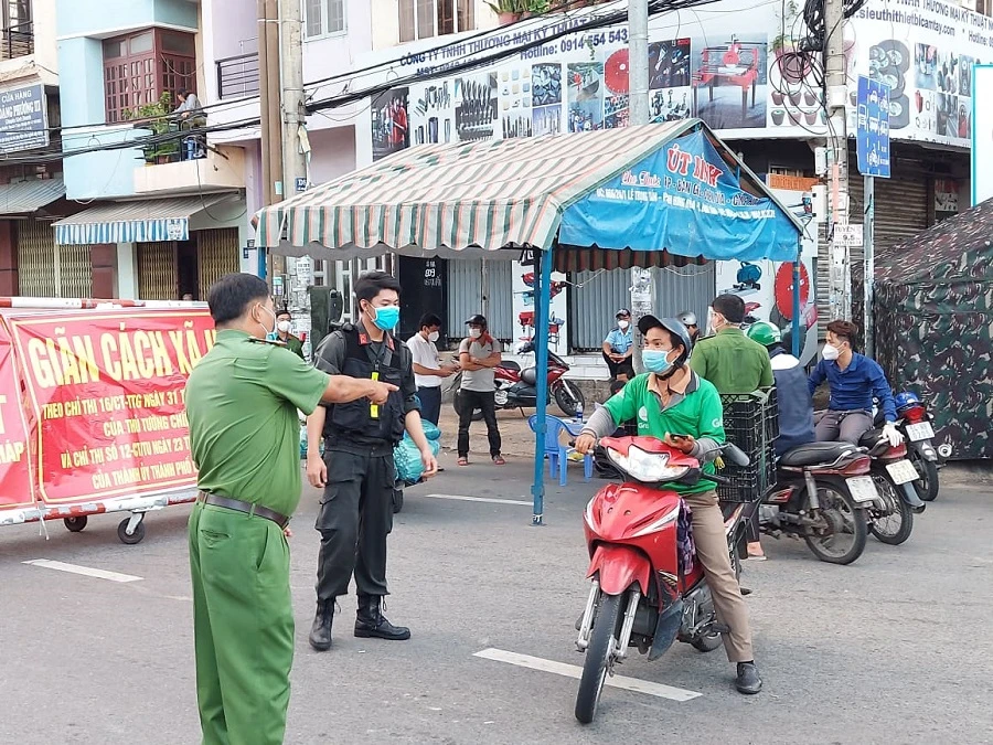 Lực lượng chức năng kiểm tra tại một điểm chốt trên đường Lê Trọng Tấn, quận Tân Phú.