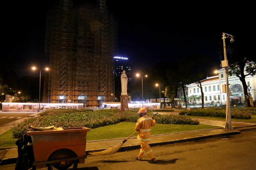 Khu vực Nhà thờ Đức Bà, Bưu điện TP (quận 1) chỉ có công nhân dọn vệ sinh trong đêm.