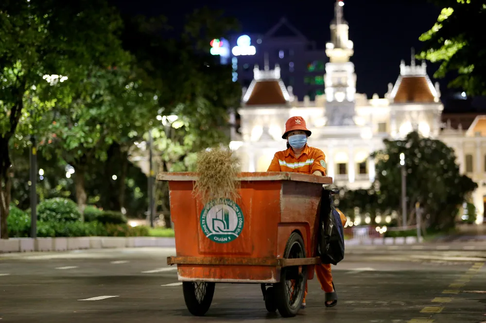 Công nhân dịch vụ công ích quận 1 làm việc trên đường Nguyễn Huệ.