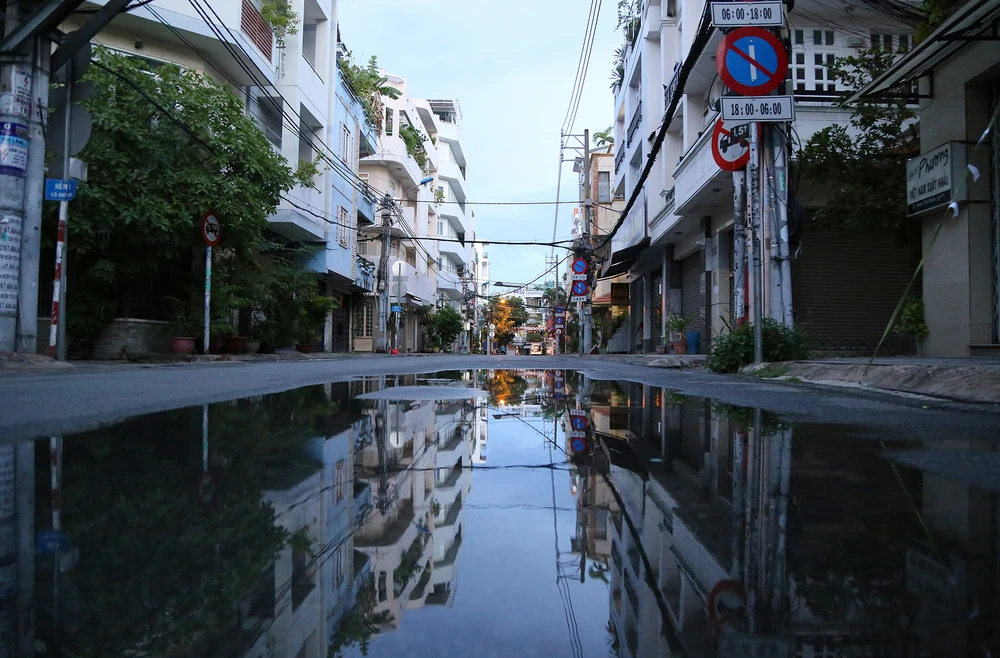 Mưa đã tạnh nhưng nước còn đọng trên đường Đoàn Thị Điểm (quận Phú Nhuận), những dãy nhà đóng cửa dù mới hơn 18 giờ.