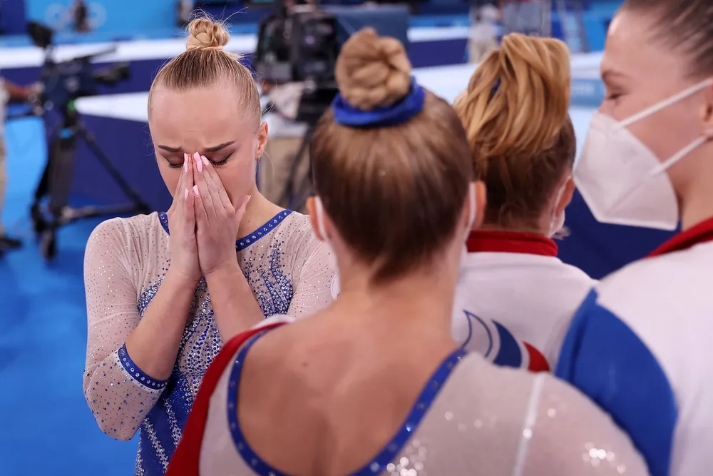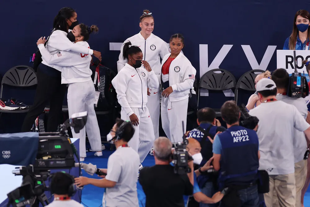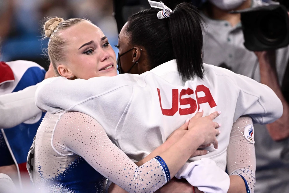 Simon Biles bỏ dở chừng nội dung đồng đội nữ do bất ổn tâm lý lao vào ôm chầm các đồng nghiệp Nga sau khi Nga đoạt HCV.