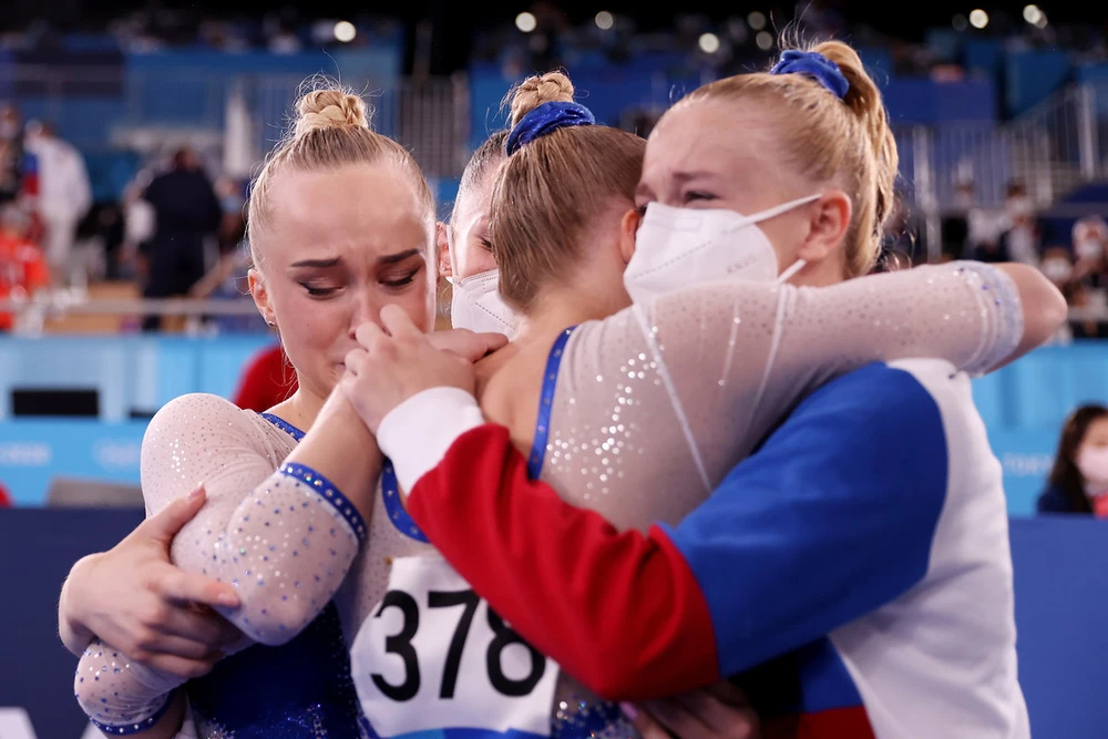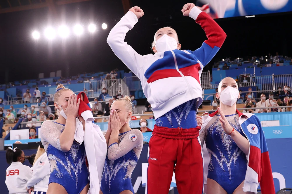 Các VĐV TDDC Nga ôm chầm ăn mừng HCV đồng đội nữ Olympic Tokyo.