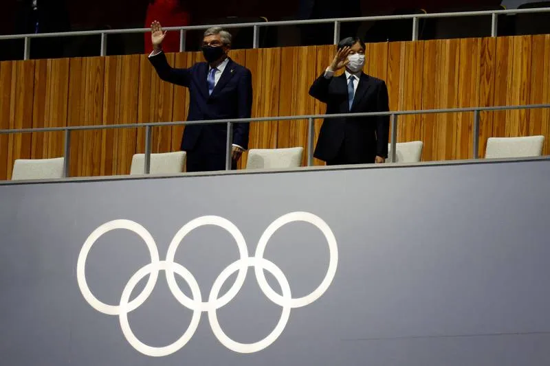 Nhật Hoàng Naruhito (phải) và Chủ tịch IOC Thomas Bach trên lễ đài