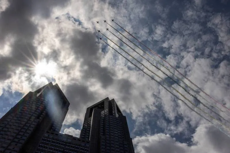 Đội phản lực cơ bay trên bầu trời sân Olympic ở Tokyo