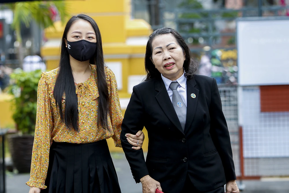 Đến dự phiên phúc thẩm chị Hường đã có thể tự đi mà không dùng nạng gỗ.