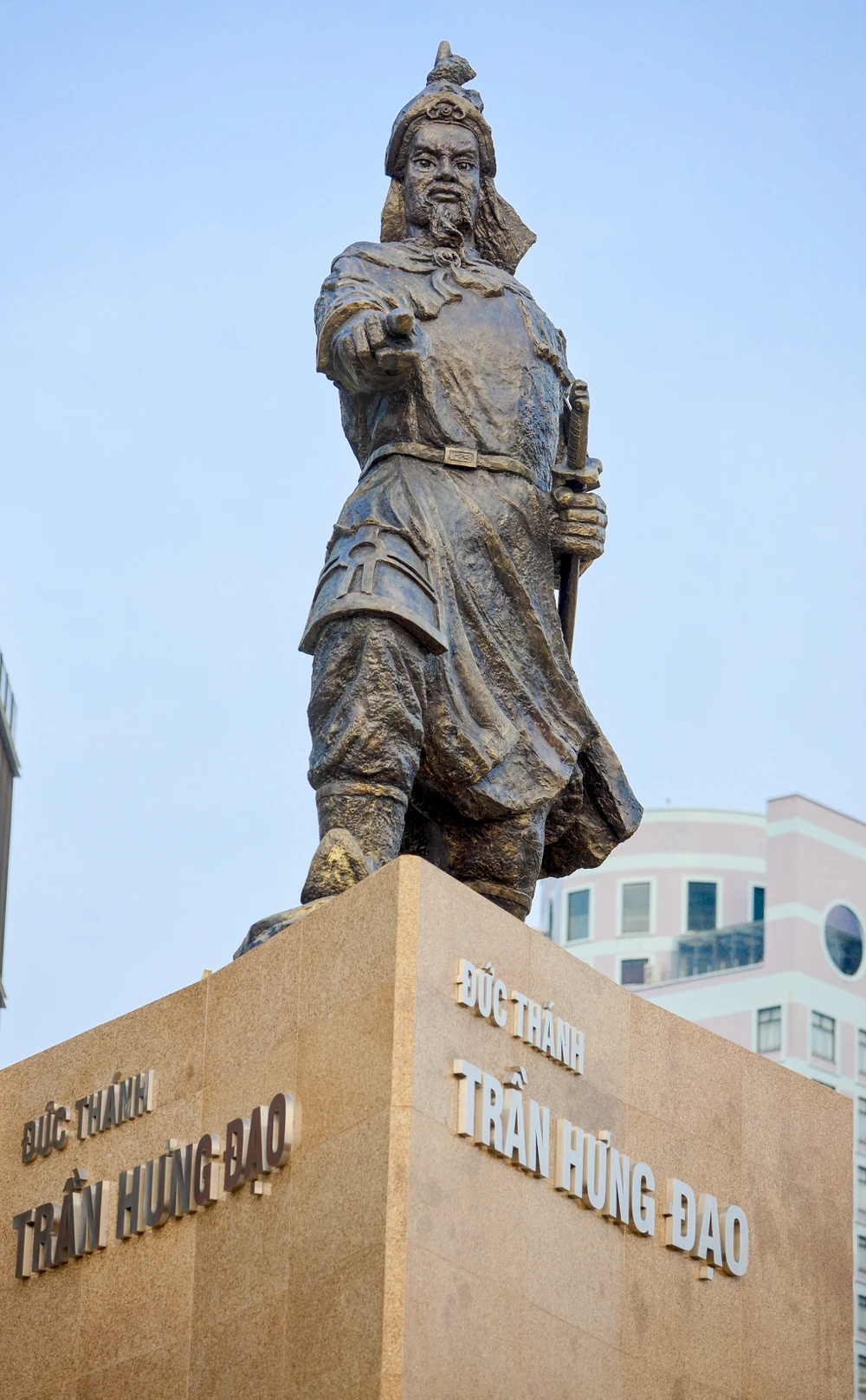 Tượng Đức Thánh Trần Hưng Đạo cao gần 6m, đứng trên một bục lăng trụ tam giác cao khoảng 10m.