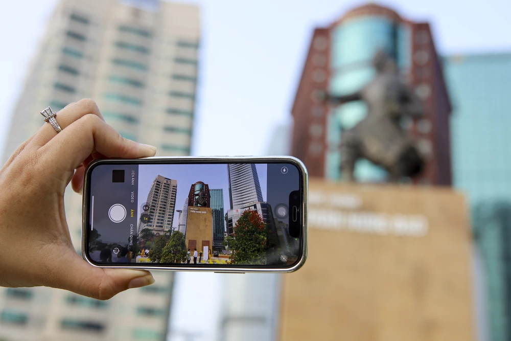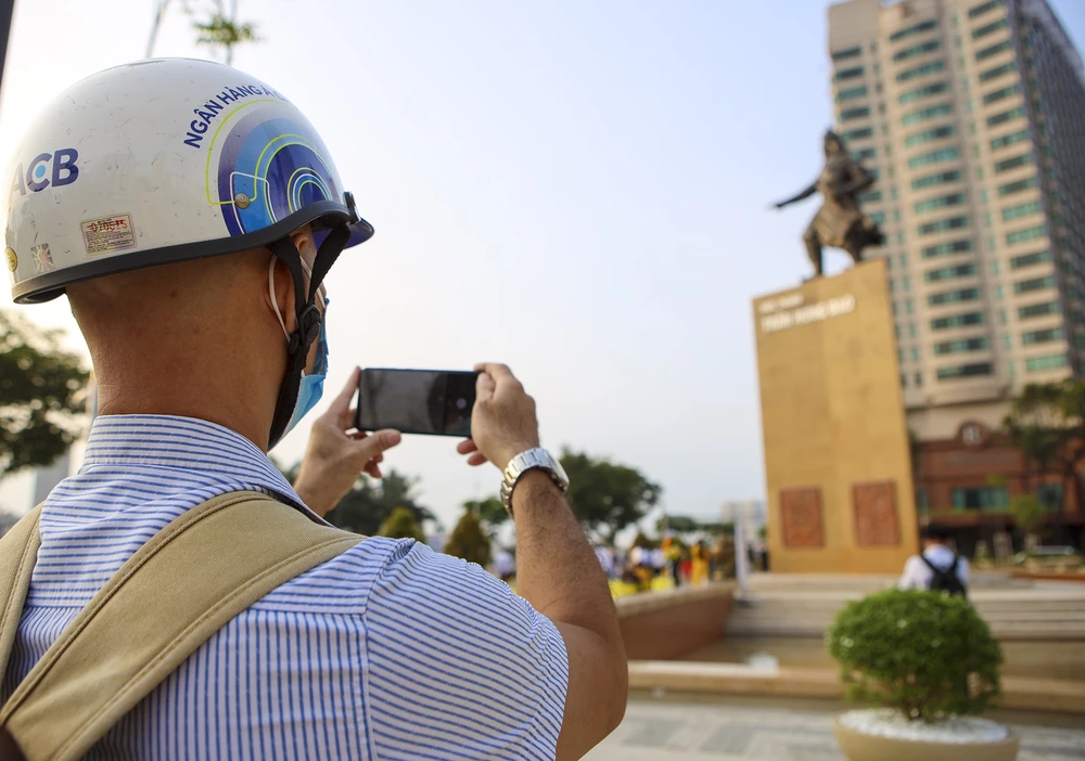 Người dân dùng điện thoại chụp lại tượng Đức Thánh Trần.