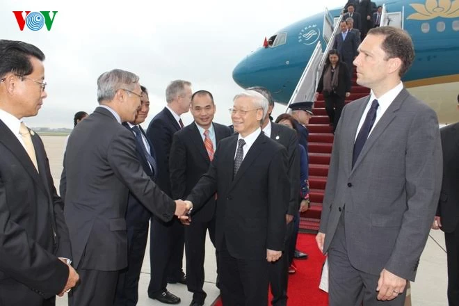 Tổng Bí thư Nguyễn Phú Trọng vui mừng bắt tay, thăm hỏi đại diện cộng đồng người Việt ra đón đoàn.