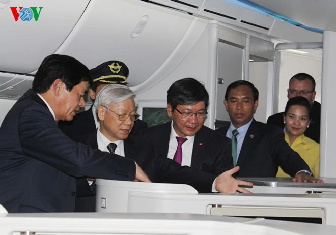 Tổng Bí thư Nguyễn Phú Trọng tham quan các khoang máy bay Boeing 787-9 Dreamliner. Ảnh: TTXVN