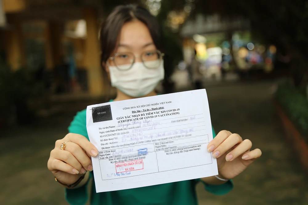 Các em được cấp giấy chứng nhận ngay sau khi kết thúc 30 phút theo dõi sau tiêm. Ảnh: HOÀNG GIANG