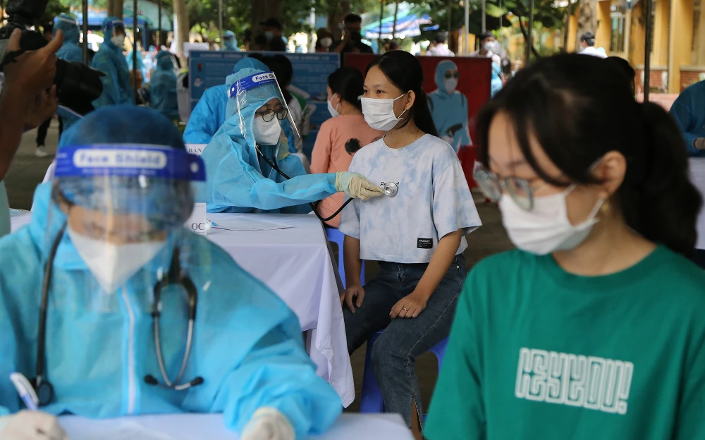 Bộ phận tại điểm tiêm đang kiểm tra thông tin các em trước khi vào khám sàng lọc. Ảnh: HOÀNG GIANG