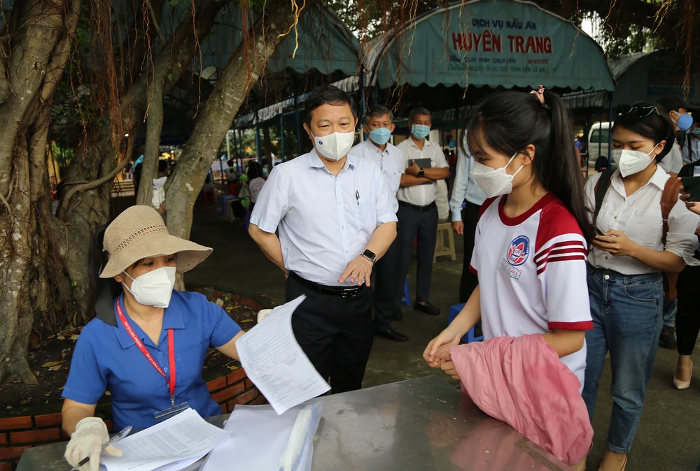 Phó chủ tịch UBND TP.HCM kiểm tra tại khu vực gọi các em vào tiêm. Ảnh: HOÀNG GIANG