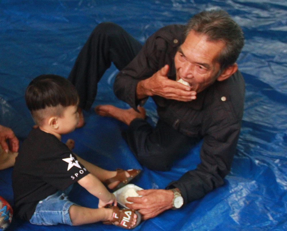 Ông cháu tranh thủ lót dạ.