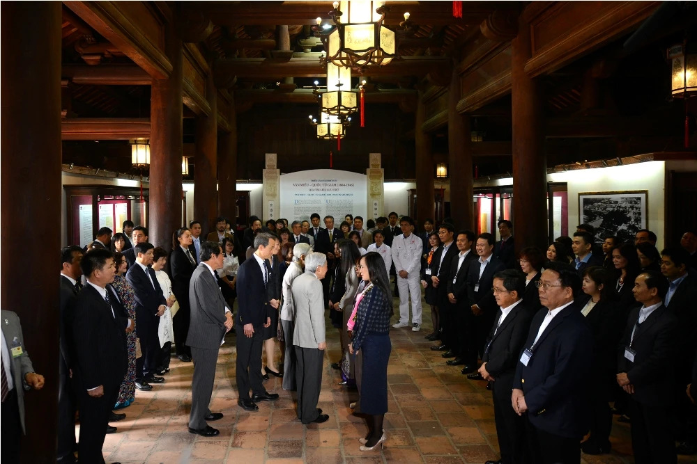 Ngày 2-3, Nhà vua và hoàng hậu Nhật Bản đã có chuyến thăm Di tích Văn Miếu - Quốc Tử Giám. Hàng trăm người dân Thủ đô đã có mặt từ sớm để chào đón Nhật hoàng Akihito.