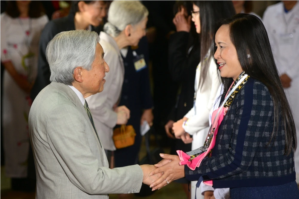 Bà Ngô Minh Thủy, Phó Hiệu trưởng đại học Ngoại ngữ, đại học Quốc gia Hà Nội, Chủ tịch Hội cựu lưu học sinh Việt Nam tại Nhật Bản trò chuyện cùng nhà vua Akihito