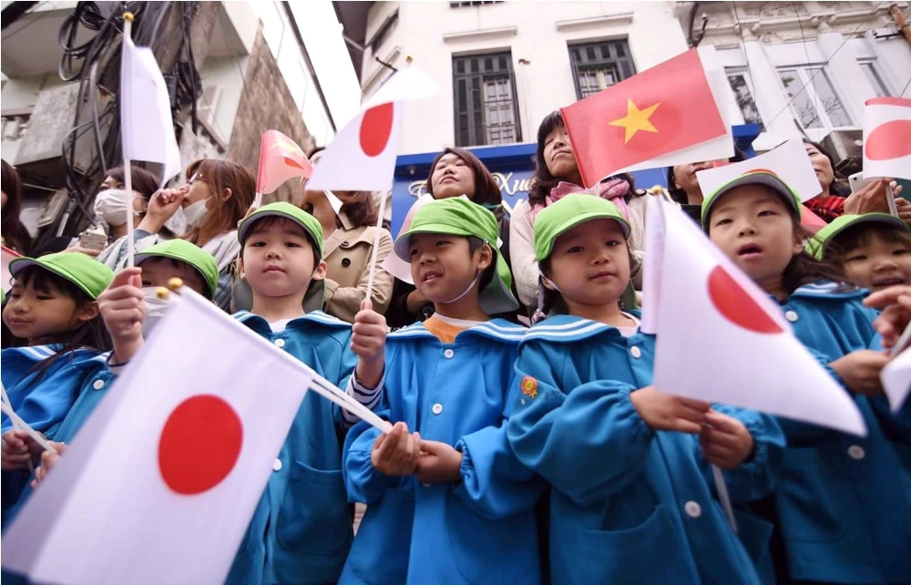 Các cháu thiếu nhi của một trường mẫu giáo Nhật Bản đứng trên vỉa hè chào đón đoàn.