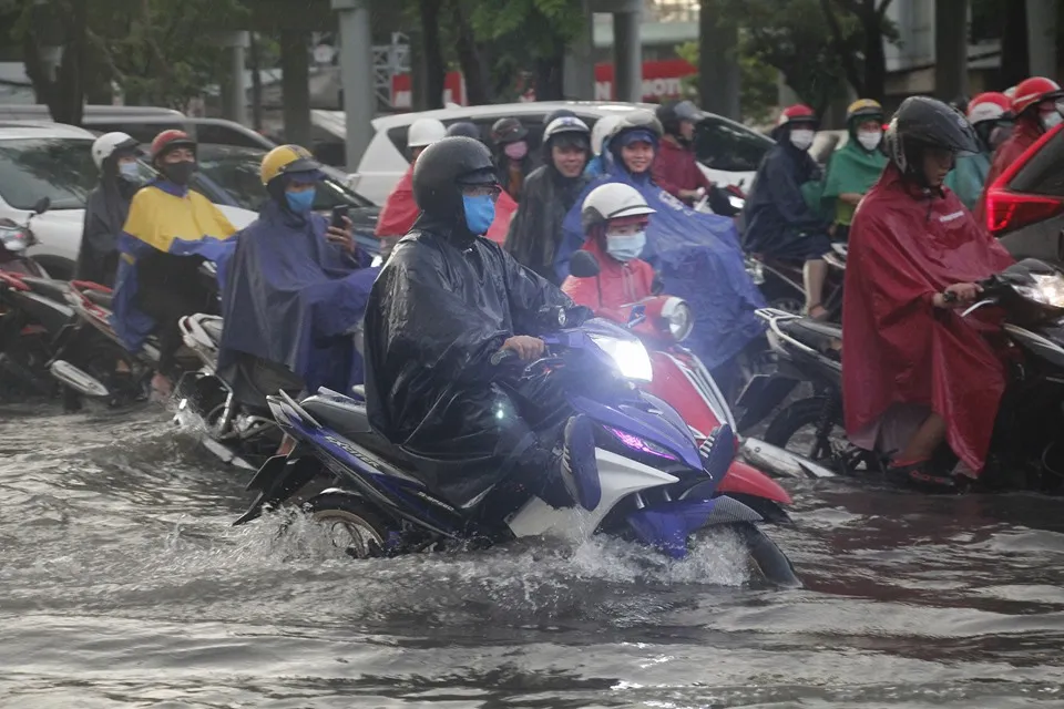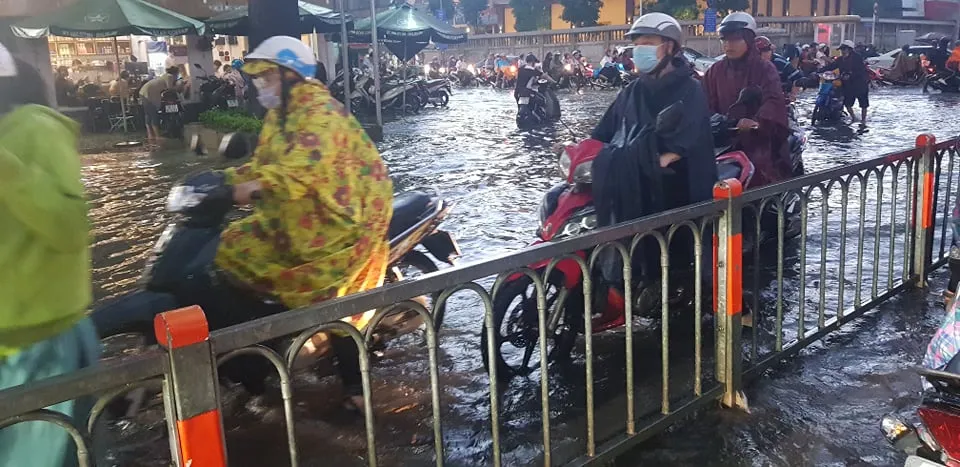 Tình trạng ngập nước sau cơn mưa lớn và kéo dài tại TP.HCM vào chiều ngày 16-6, việc đi lại của người dân gặp khó khăn. Giờ tan tầm, có những nơi nước ngập đến gần nửa mét khiến nhiều người đi xe máy phải vật vã trong biển nước.