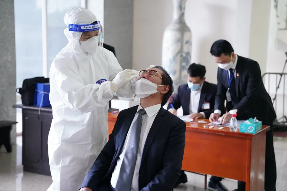 Lực lượng y tế lấy mẫu xét nghiệm COVID-19 đối với những người tham gia phiên tòa