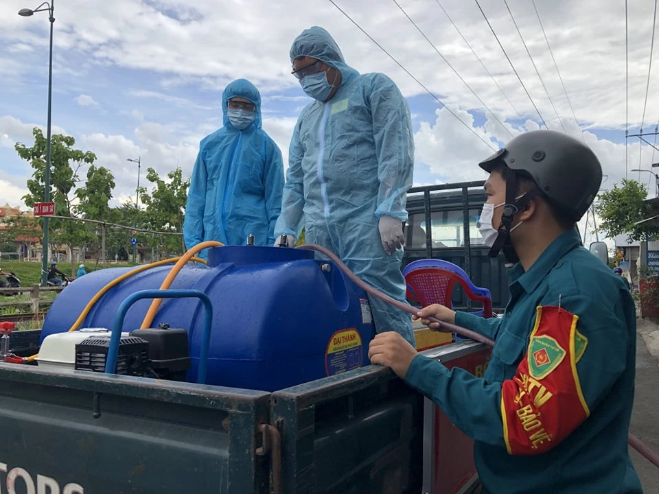 Lực lượng quân sự TP Thủ Đức tiến hành phun 2.500 lít nước pha thuốc trong chiều 11-6.
