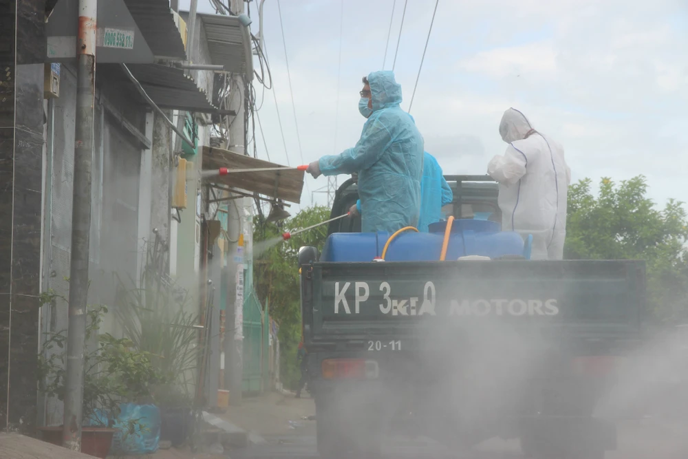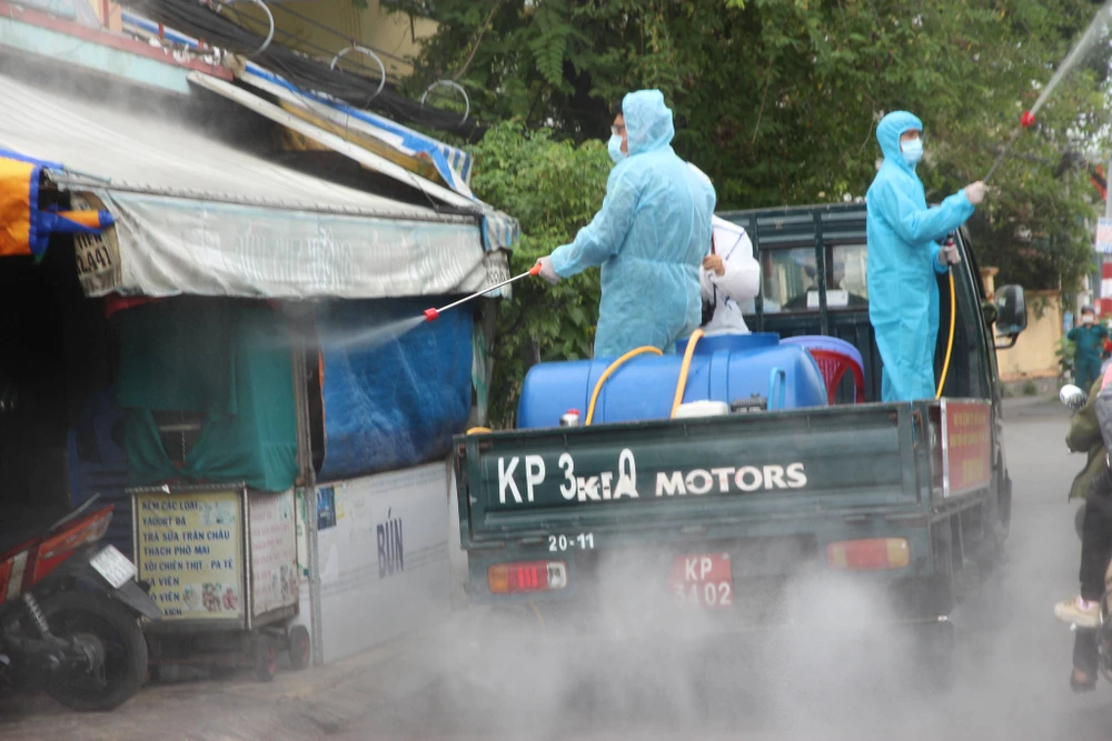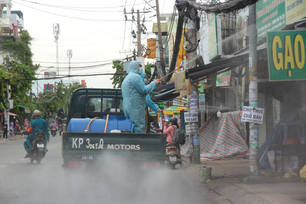 Bốn tuyến đường tại phường Hiệp Bình Chánh, TP Thủ Đức được phun thuốc khử khuẩn chiều 11-6.