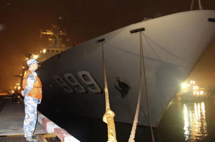 Sĩ quan hải quân, quân đội Trung Quốc bên cạnh con tàu chiến Jinggangshan, một trong những tàu chiến lớn nhất của Trung Quốc, tại bến cảng Trạm Giang ở tỉnh Quảng Đông. Con tàu này sẽ tham gia cứu nạn chuyến bay MH 370.