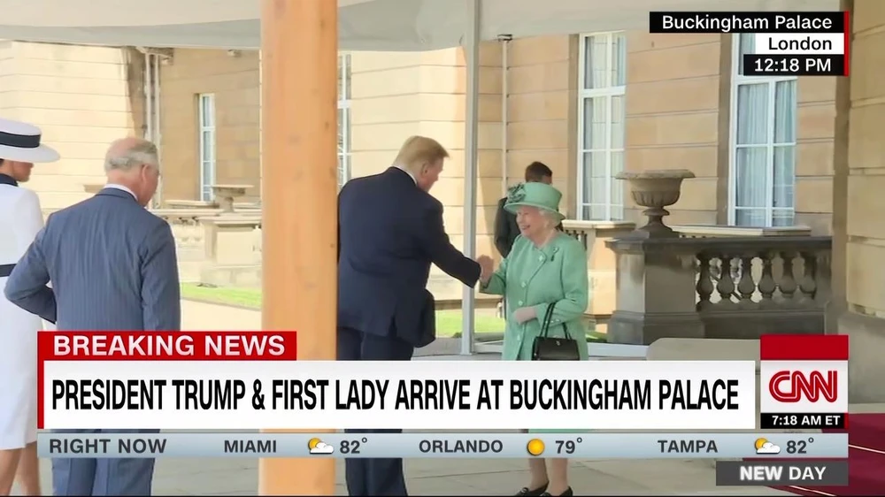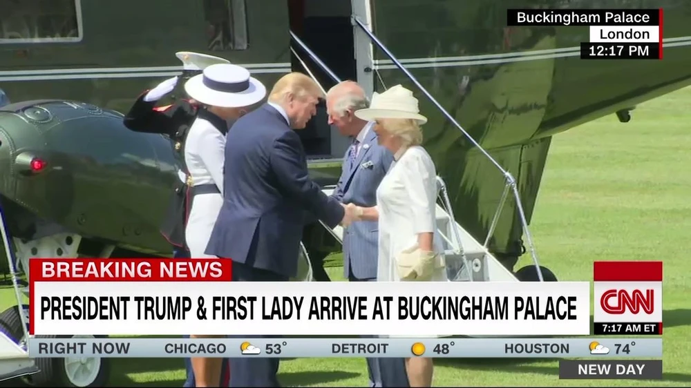 Đón vợ chồng Tổng thống Trump đầu tiên tại Cung điện Buckingham là vợ chồng Thái tử Charles. Tổng thống Trump cười tươi và được vợ chồng Thái tử Charles dẫn vào trước cửa Cung điện. Tại đây Nữ hoàng Elizabeth đã chờ đón.