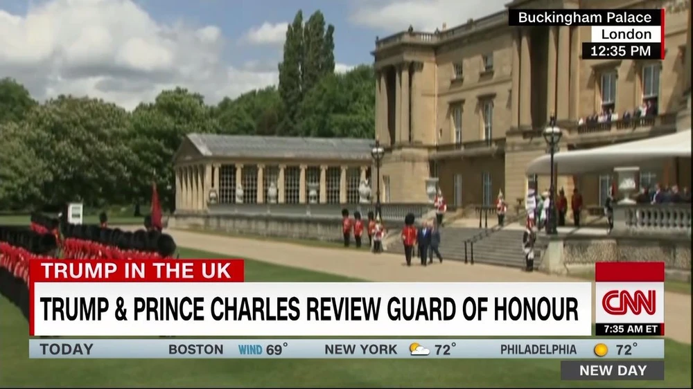 Tổng thống Trump và Thái tử Charles cùng duyệt binh, trong khi Nữ hoàng Elizabeth và Đệ nhất phu nhân Mỹ Melania Trump đứng bên trong. Ảnh: CNN