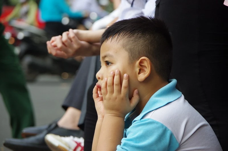 Minh Quân, cậu bé nhỏ ngồi bệt xuống đất chờ xe chở linh cữu cố Thủ tướng Phan Văn Khải. Ảnh: THANH TUYỀN