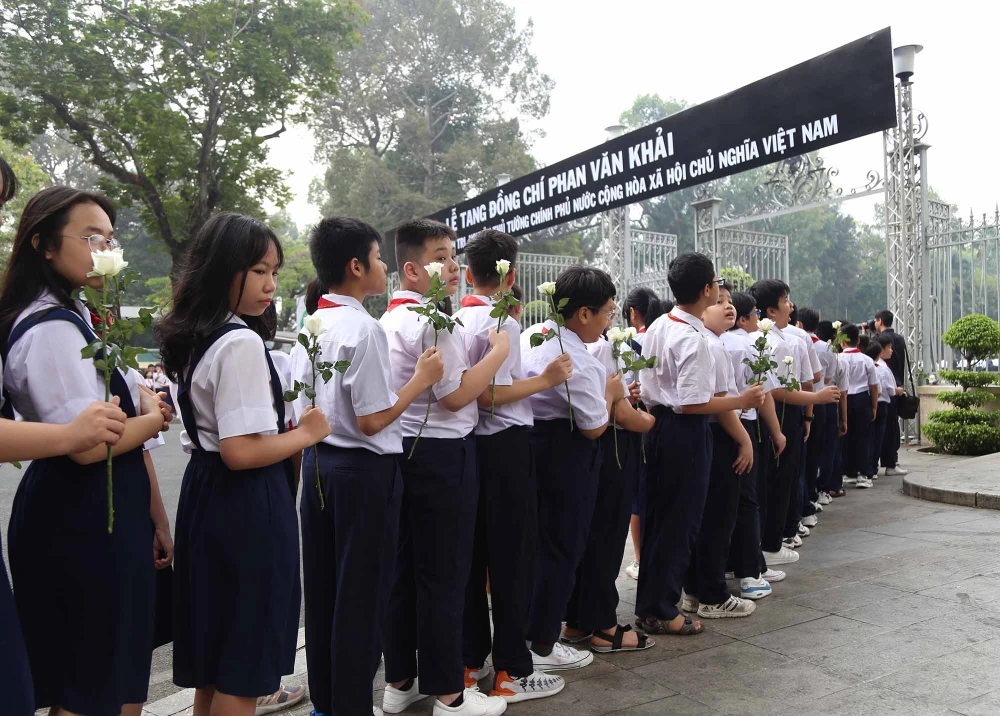 Từ rất sớm, đông đảo học sinh Trường THCS Lê Quý Đôn trên tay cầm hoa hồng trắng đứng hai bên cổng Hội trường Thống Nhất để tiễn biệt cố Thủ tướng Phan Văn Khải.