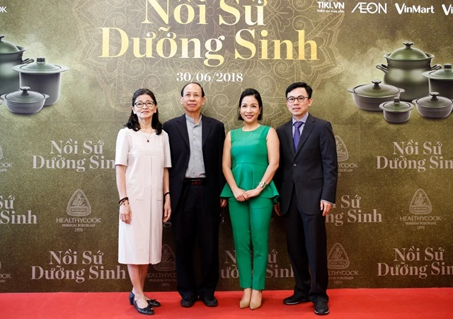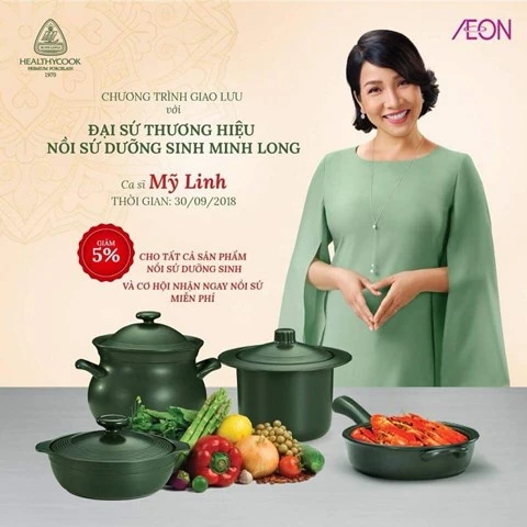 Ca sĩ Mỹ Linh cùng lãnh đạo Công ty Gốm sứ Minh Long trong một sự kiện quảng cáo sản phẩm sứ dưỡng sinh của Minh Long.