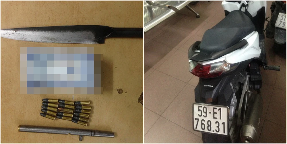 Tổ công tác phát hiện trong cốp xe của hai thanh niên này có một con dao dài khoảng 25 cm đầu sắc nhọn. Trong túi quần thanh niên ngồi sau có một cây súng. Trong túi xách của thanh niên ngồi sau có 16 viên đạn, một bịch nylon có chất bột màu trắng nghi ma túy gói trong tờ tiền 5.000 đồng.