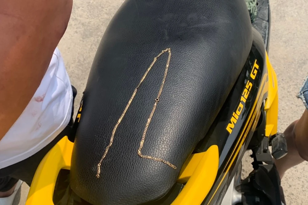Cả hai phát hiện chị LTV (42 tuổi, quê Vĩnh Long) đứng mua đồ, trên cổ đeo sợi dây chuyền trọng lượng hai chỉ vàng nên áp sát, cướp giật.