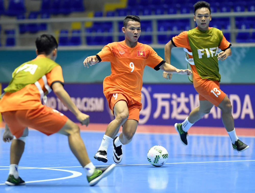 Các tuyển thủ Futsal Việt Nam nỗ lực trên sân tập với khát khao giành vé vào tứ kết World Cup. Ảnh: ANH ĐOÀN
