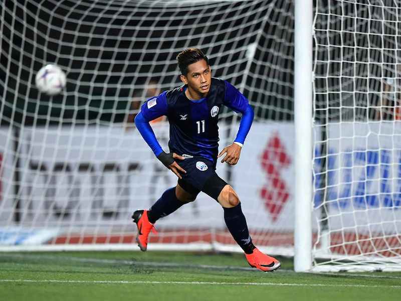 “Messi Campuchia” Chan Vathanaka ghi bàn vào lưới đội Lào. Ảnh: CCT