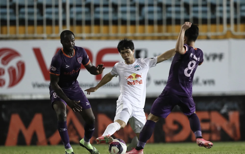 Công Phượng (giữa) trong một chiều chơi rất bình thường trước B. Bình Dương. Ảnh: ANH ĐỒNG