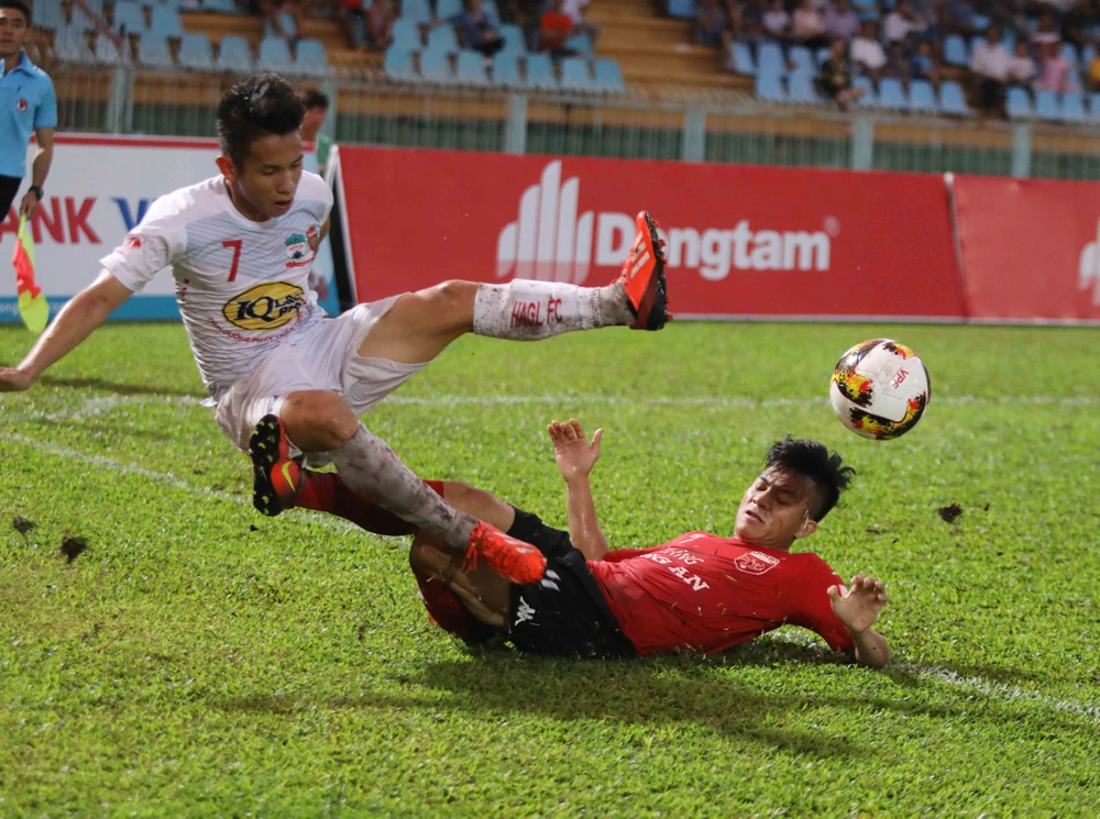 HA Gia Lai có nhiều tuyển thủ quốc gia bất ngờ bị ngáng chân bởi đội khách Sanna Khánh Hòa không có tuyển thủ nào. Ảnh: HUY PHẠM