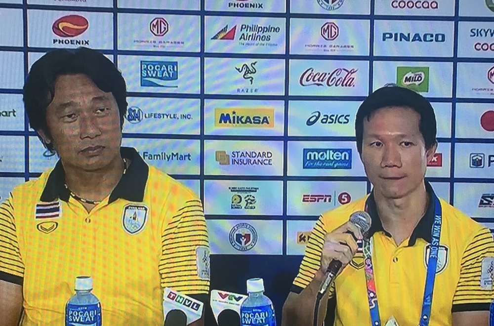 HLV Naruephon Kaenson (trái) của tuyển nữ Thái Lan trong buổi họp báo sau khi thua Việt Nam ở chung kết SEA Games 30.